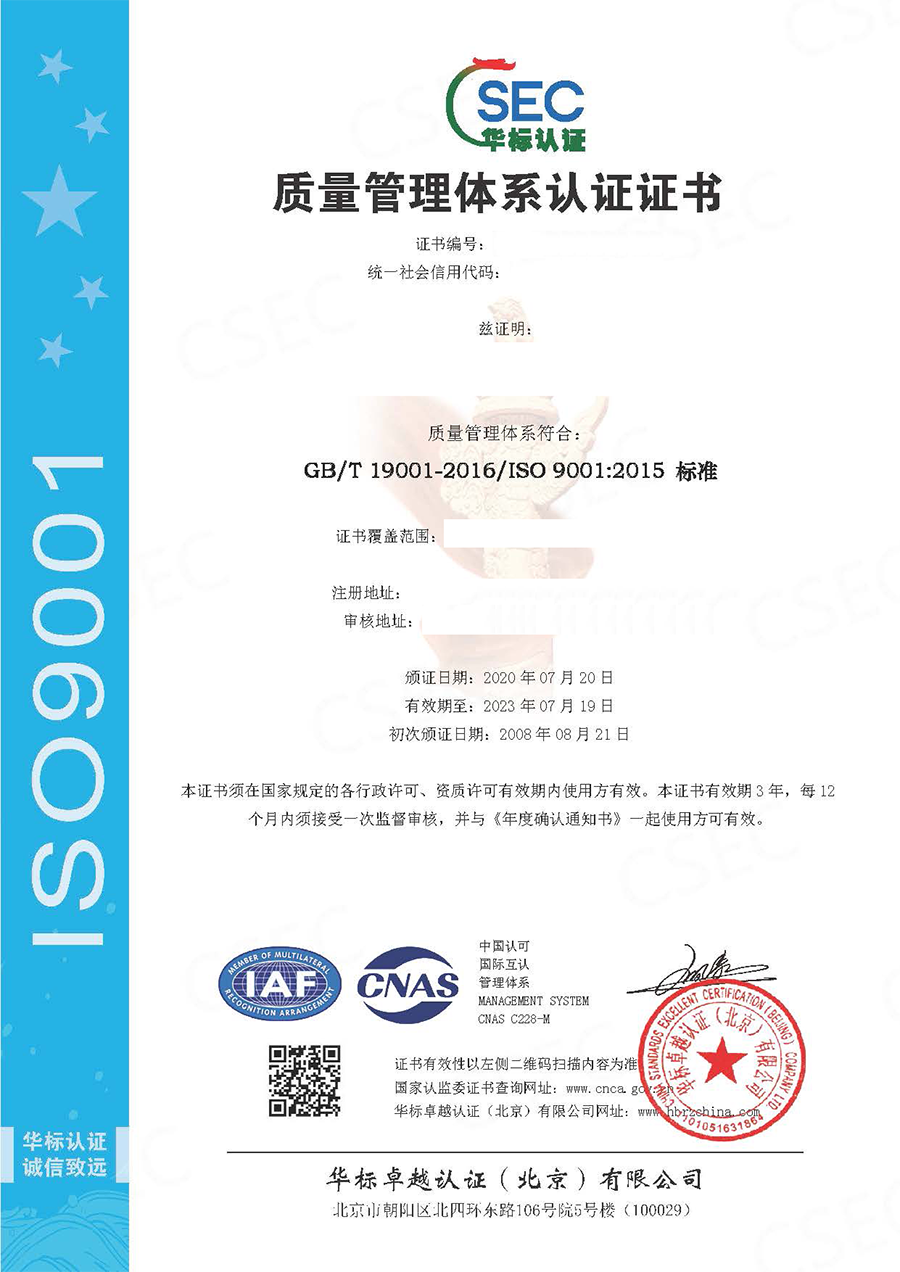 ISO质量管理体系认证证书